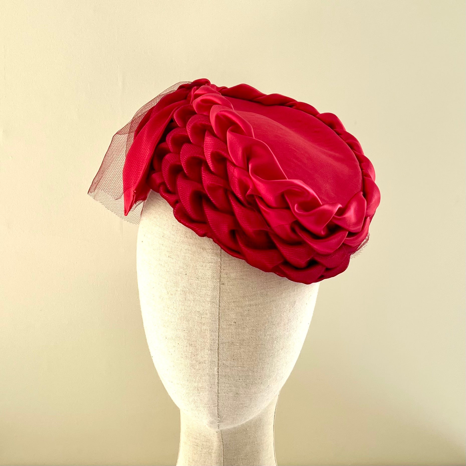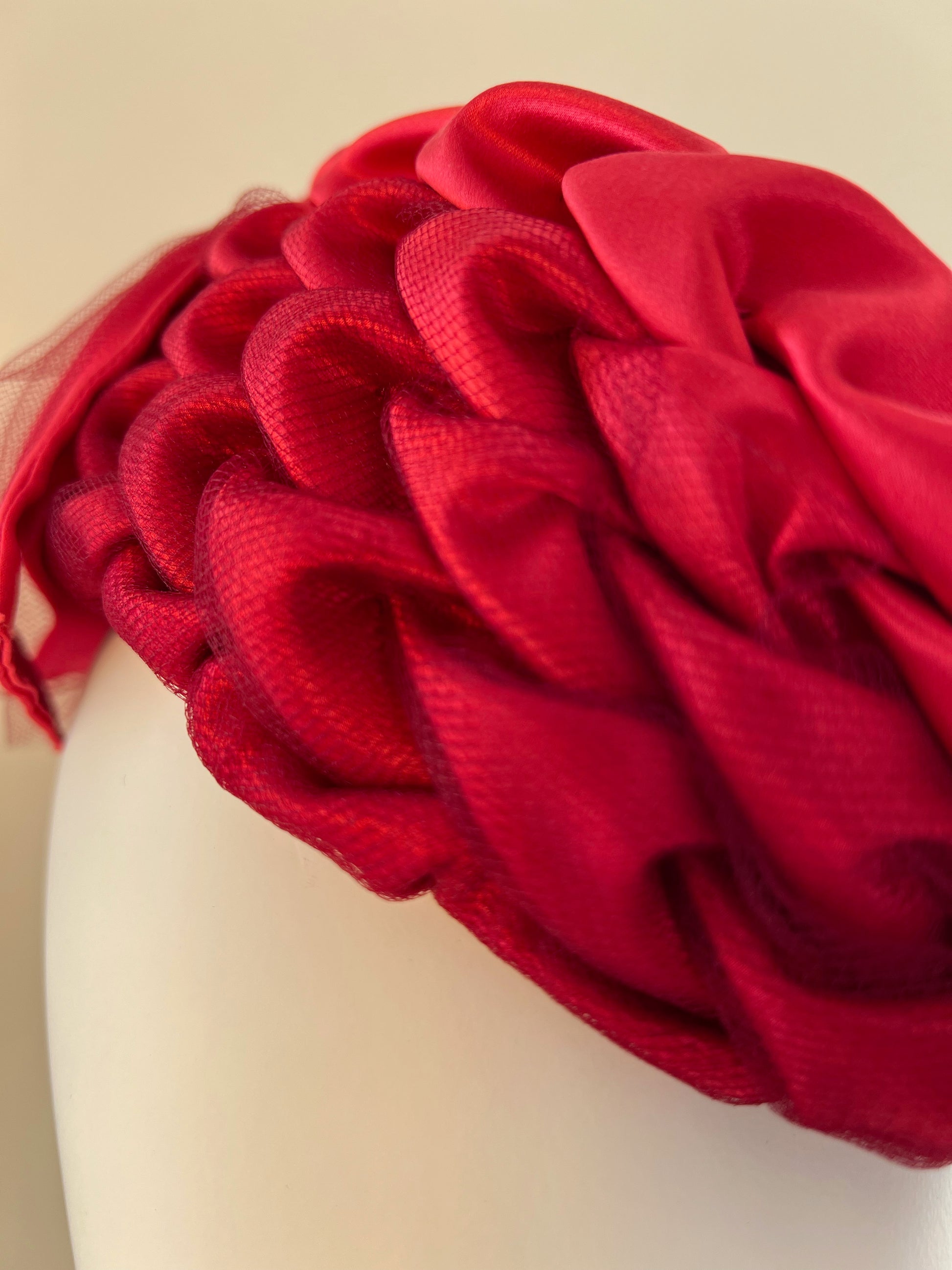 A forward sitting high pillbox made of pure silk satin overlaid with ombré soft tulle