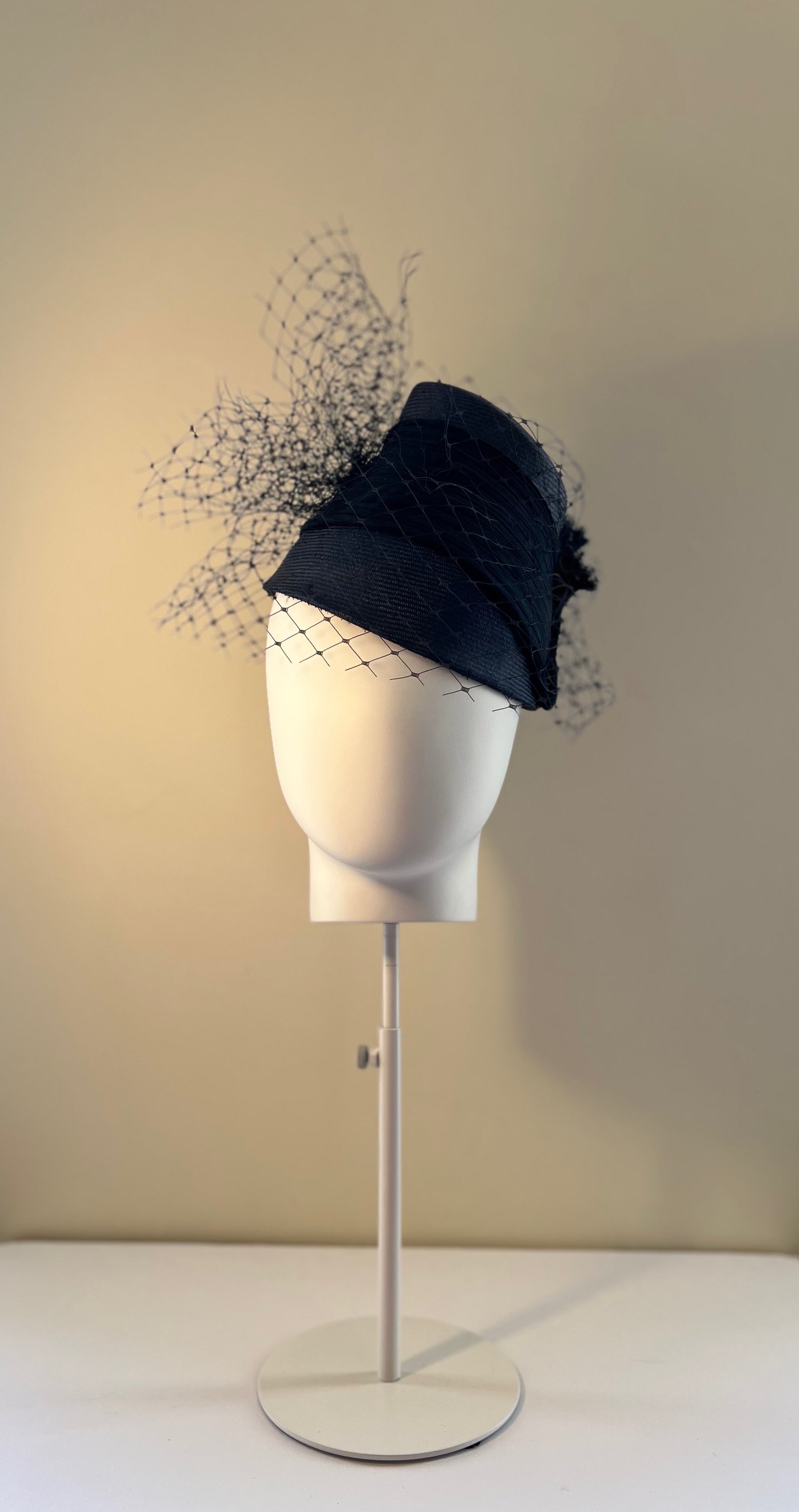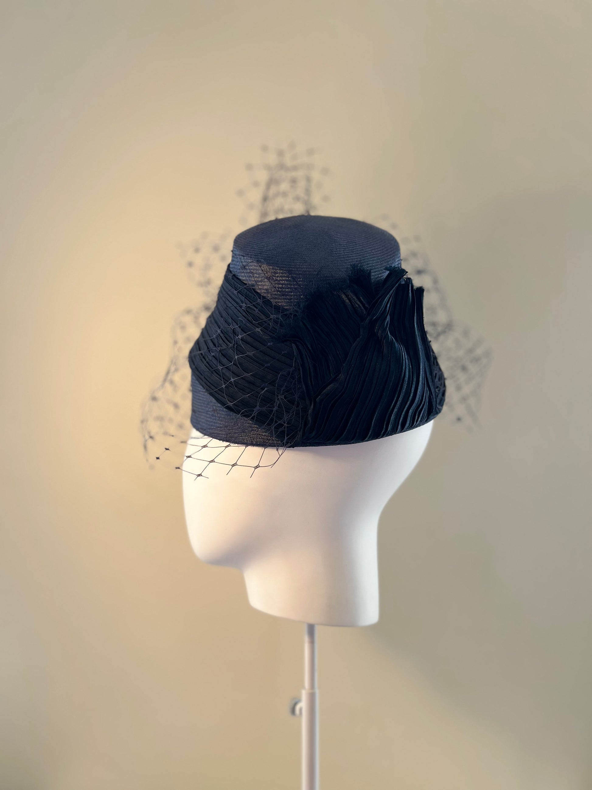 This petite toque is made in deep navy vintage straw and formed on a 1940s Parisian hat block