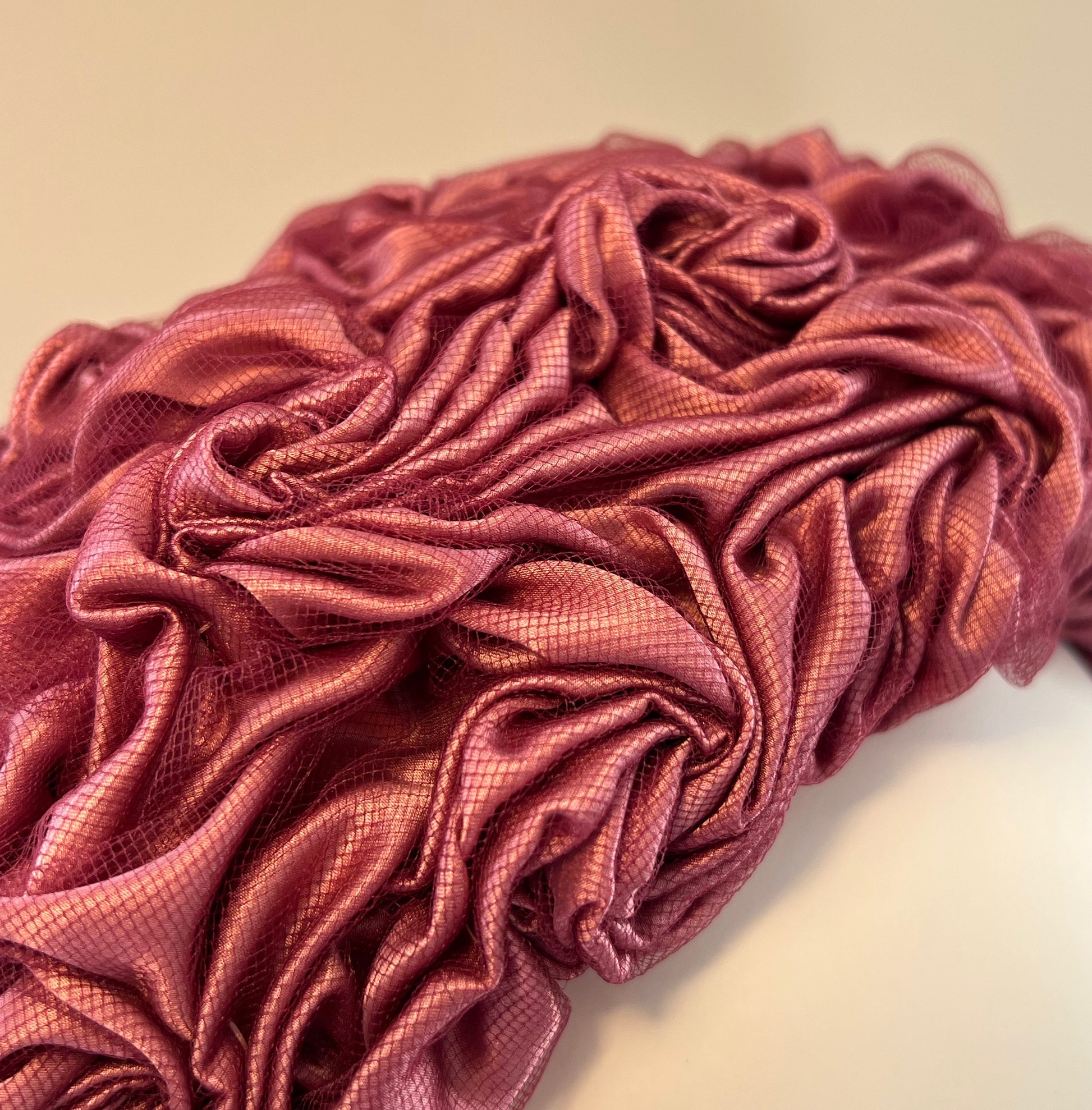 Rich sumptuous silk, overlaid with tulle and hand-smocked into roses